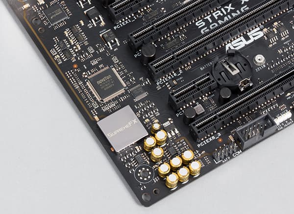 Аудиоподсистема платы Asus Strix X99 Gaming имеет маркетинговое название SupremeFX. Она включает в себя популярный 8-канальный (7.1) HDA-аудиокодек Realtek ALC1150, который закрыт металлических кожухом. Все элементы аудиотракта изолированы на уровне слоев PCB от прочих компонентов платы и выделены в отдельную зону.