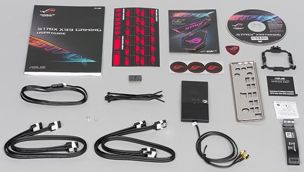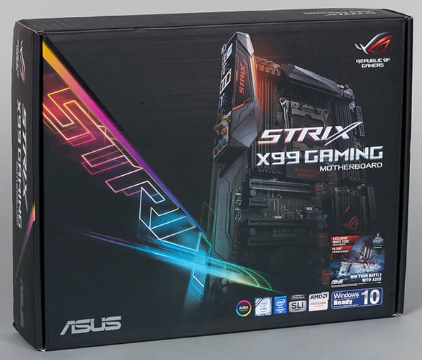 Плата Asus Strix X99 Gaming поставляется в средней по своим размерам коробке черного цвета, на которой методом ламинации нанесено название платы и логотипы поддерживаемых технологий. Кроме самой платы в комплект поставки входит инструкция пользователя (только на английском языке), DVD-диск с программным обеспечением и драйверами, четыре SATA-кабеля (все разъемы с защелками, два кабеля имеют угловой разъем с одной стороны), мостик SLI на две видеокарты, заглушка задней панели платы, антенна для Wi-Fi модуля, традиционный Asus Q-коннектор для облегчения подключения проводов от кнопки питания, перезагрузки и т. д., а так же кабельные стяжки, кабель RGB Header, наклейки различных цветов на радиатор и кожух задней панели. Есть и специальная монтажная рамка для облегчения установки процессора в разъем.