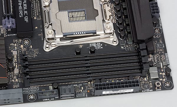 Для установки модулей памяти на плате Asus Strix X99 Gaming предусмотрено восемь DIMM-слотов, что позволяет устанавливать по два DDR4-модуля на каждый из четырех каналов памяти с максимальным объемом до 128 ГБ (при использовании 16-гигабайтных модулей памяти). Отметим также, что плата поддерживает память с XMP-профилями.