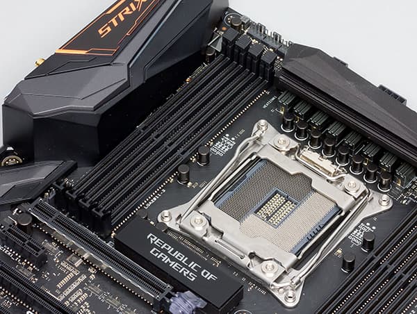 Плата Asus Strix X99 Gaming основана на чипсете Intel Х99 и поддерживает процессоры c кодовым наименованием Haswell-E и Broadwell-E с разъемом LGA2011-v3. Для установки процессора используется не обычный разъем LGA2011-v3, а патентованный разъем Asus O.C. Socket (как и на всех платах Asus c разъемом LGA2011-v3). Напомним, что в этом разъеме задействуются зарезервированные для отладочных целей контакты процессора, что позволяет улучшить стабильность напряжения питания на процессоре и исключить его проседание при стрессовой загрузке.