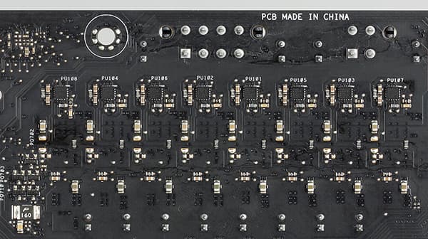 Еще одна уникальная особенность платы — это реализация фирменной подсветки Asus Aura RGB. Во-первых, задняя панель платы с портами ввода/вывода имеет небольшой пластиковый кожух с полупрозрачной надписью Strix. Под этим кожухом находится небольшая плата Strix RGB LED Strip с несколькими светодиодами. Соответственно, эти светодиоды подсвечивают надпись Strix на кожухе.