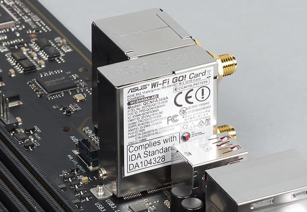 Кроме того, на плате установлен модуль беспроводной связи Asus Wi-Fi Go!, который поддерживает стандарты 802.11a/b/g/n/ac и, соответственно, является двухдиапазонным (2,4 и 5 МГц). Данный модуль имеет две антенны. Также модуль Asus Wi-Fi GO! имеет и встроенный чип Bluetooth V4.1.
