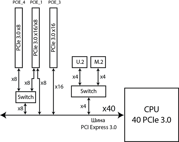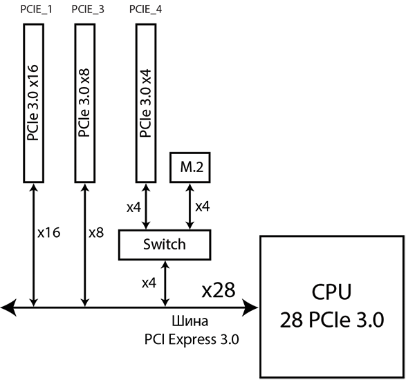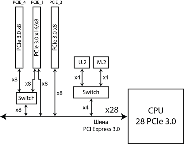 Как видим, и в случае процессора с 40 линиями PCIe 3.0 и в случае процессора с 28 линиями PCIe 3.0 остается незадействованными, как минимум, 4 линии PCIe 3.0. Эти четыре процессорные линии PCIe 3.0 используются для реализации разъемов M.2 и U.2, но об этом чуть позже.