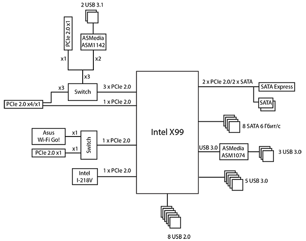 Если посчитать количество контроллеров, разъемов и слотов, использующих порты (линии) PCIe 2.0 чипсета Intel X99, то получится следующая картина. На слот PCI Express 2.0 x4 требуется четыре порта PCIe 2.0. Еще два порта PCIe 2.0 задействуют два слота PCI Express 2.0 x1. Кроме того, контроллер ASMedia ASM1142, сетевой контроллер Intel I218-V и модуль беспроводной связи Asus Wi-Fi Go! — это еще четыре порта PCIe 2.0. Разъем SATA Express — это еще два порта PCIe 2.0. В результате получаем, что всего требуется 12 портов PCI Express 2.0.