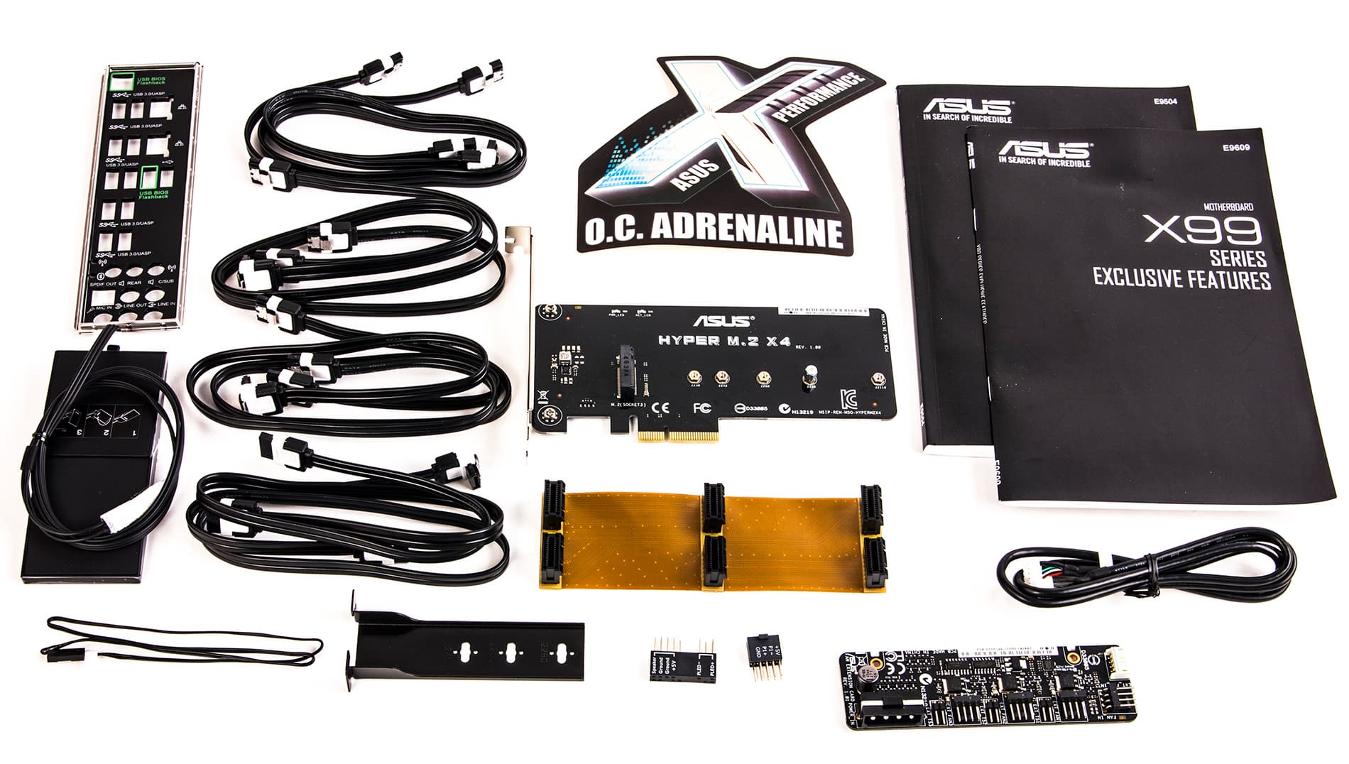 Плата Asus X99-Deluxe поставляется в достаточно компактной коробке черного цвета, на которой методом ламинации нанесено название платы и логотипы поддерживаемых технологий. Кроме самой платы в комплект поставки входит инструкция пользователя (только на английском языке), DVD-диск с программным обеспечением и драйверами, десять SATA-кабелей (все разъемы с защелками, пять кабелей имеют угловой разъем с одной стороны), мостик SLI на три видеокарты, заглушка для задней панели платы, антенна для модуля Wi-Fi, традиционный Asus Q-коннектор для облегчения подключения проводов от кнопки питания, перезагрузки и т. д., один термодатчик, плата Hyper M.2 x4, которая представляет собой переходник с разъема PCI Express x4 на разъем M.2, а также скоба для вертикальной фиксации накопителя с разъемом M.2. Имеется в комплекте и отдельная плата (Fan Extension Card), позволяющая подключить три дополнительных вентилятора и три термодатчика. Одним словом, комплектация в полной мере соответствует понятию топового решения.