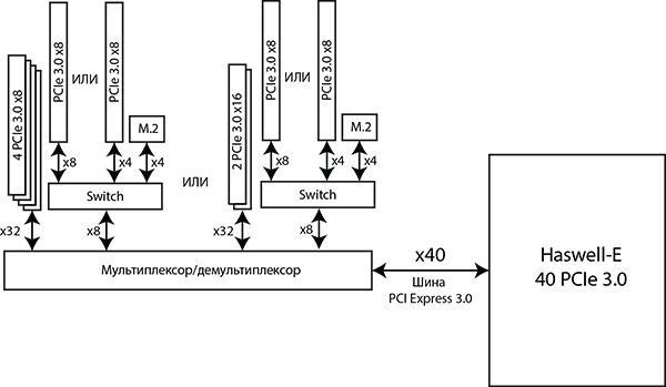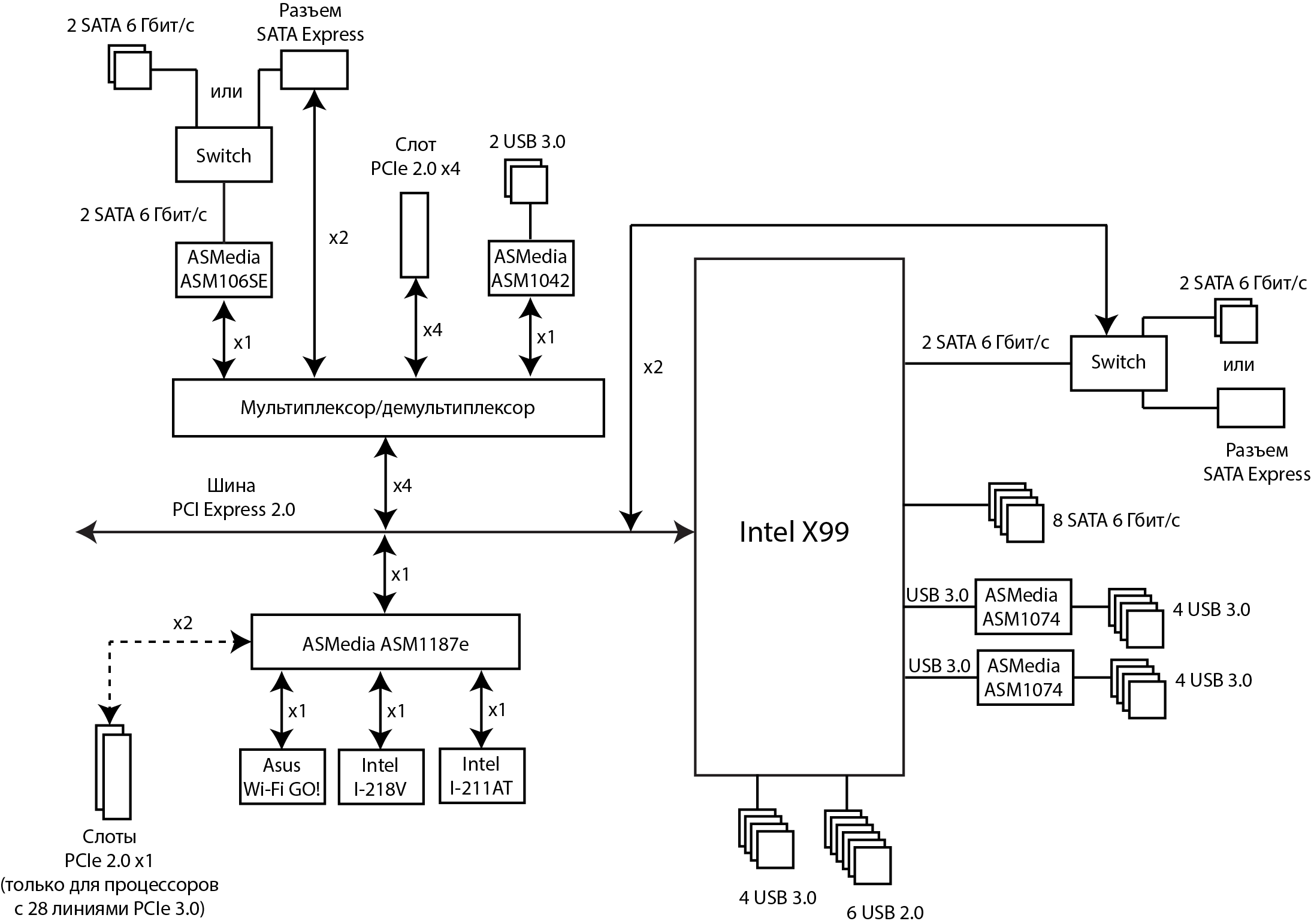 Но в чипсете Intel X99 общее количество портов PCI Express 2.0 не может превышать восьми (в этом плане чипсет Intel X99 не отличается от чипсета Intel Z97).