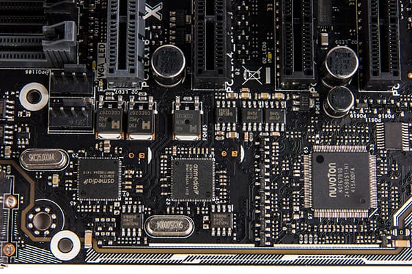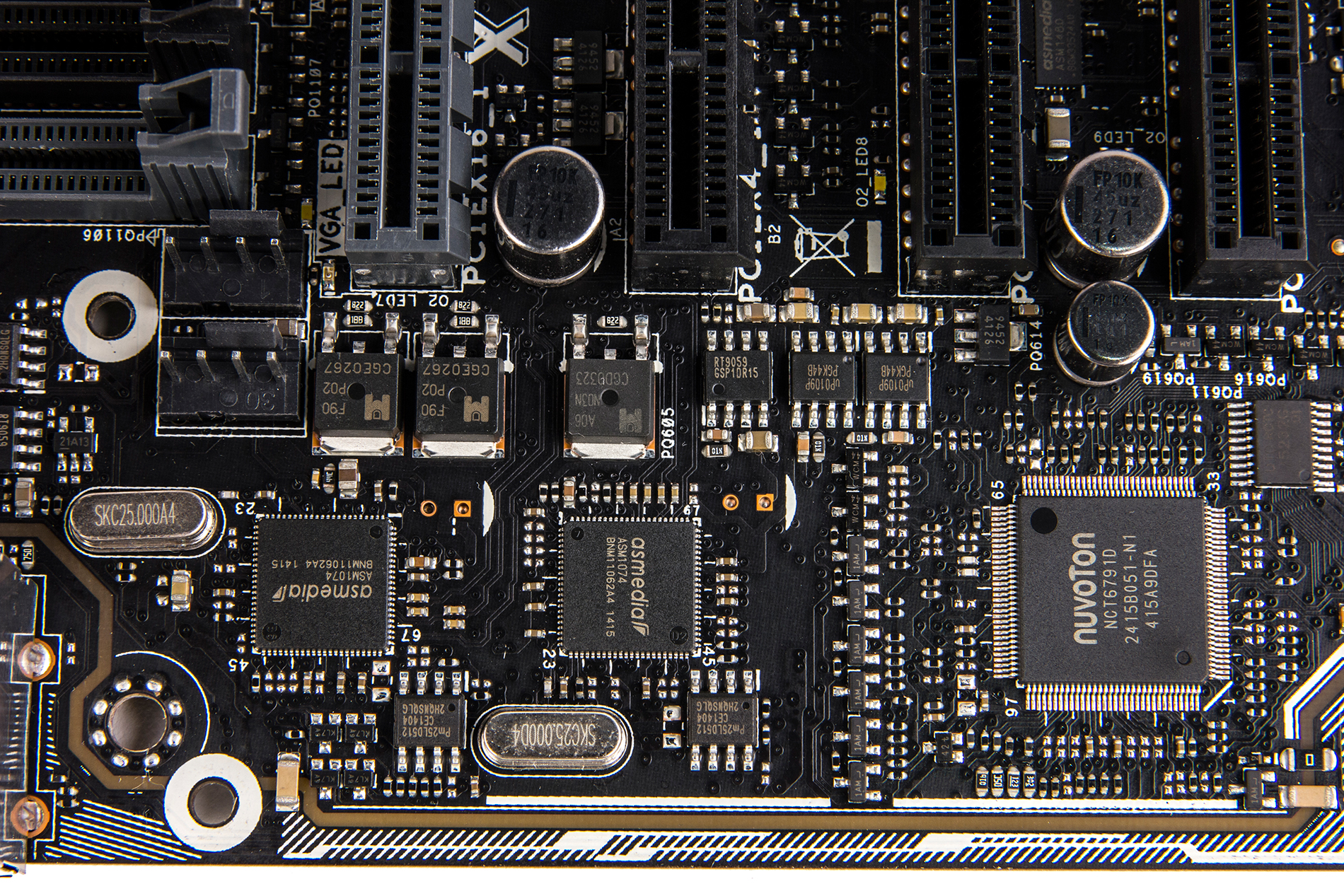 Начнем с явного дефицита портов PCI Express 2.0. Прежде всего, для увеличения портов PCI Express 2.0 на плате применяется дополнительный коммутатор ASMedia ASM1187e на восемь портов PCI Express 2.0. То есть используя на входе один порт PCI Express 2.0, коммутатор ASMedia ASM1187e предоставляет на выходе еще семь портов PCI Express 2.0.