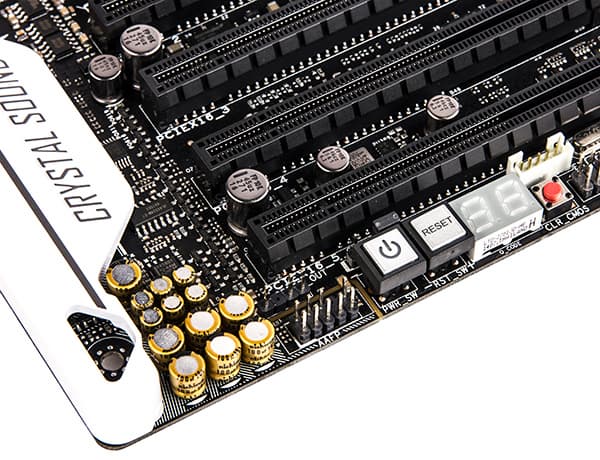 Если говорить о дополнительных особенностях платы Asus X99-Deluxe, то стоит отметить наличие кнопки включения питания и перезагрузки на самой плате. Кроме того, имеется кнопка ClearCMOS, а также индикатор POST-кодов. Традиционной кнопки DirectKey теперь нет, но вместо нее появилась перемычка с таким же названием.