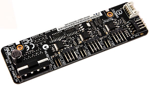 Помимо этого, для создания эффективной системы теплоотвода на плате предусмотрено два четырехконтактных разъема (CPU_FAN, CPU_OPT) для подключения вентиляторов кулера процессора и четыре четырехконтактных разъема для подключения дополнительных корпусных вентиляторов. Кроме того, если такого количества окажется недостаточно, то в комплекте к плате поставляется и дополнительная карта Fan Extension Card, которая позволяет подключить еще три дополнительных вентилятора и три термодатчика. Отметим, что управлять вентиляторами, подключенными к плате Fan Extension Card, можно через настройки UEFI BIOS.