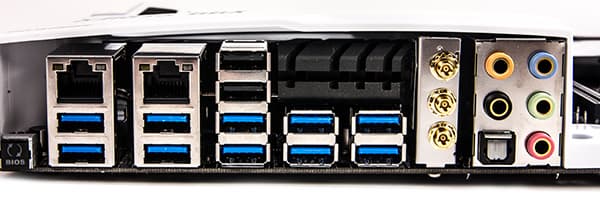 Для подключения всевозможных периферийных устройств на плате предусмотрено четырнадцать портов USB 3.0 и шесть портов USB 2.0. Отметим, что сам чипсет Intel X99 поддерживает только до 14 портов USB из которых до 6 портов могут быть портами USB 3.0. Поэтому, для реализации такого количества USB портов применяется дополнительные USB-хабы и USB-контроллер.