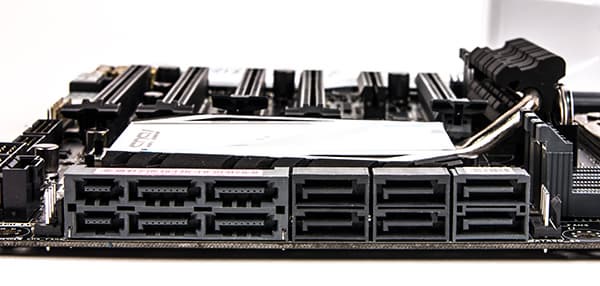 Для подключения накопителей или оптических приводов на плате предусмотрено в совокупности двенадцать портов SATA 6 Гбит/с. Это восемь отдельных портов SATA 6 Гбит/с и еще четыре порта SATA 6 Гбит/с в составе двух разъемов SATA Express. Восемь отдельных портов SATA 6 Гбит/с реализованы на базе интегрированного в чипсет Intel X99 контроллера. Еще два порта SATA 6 Гбит/с, входящие в состав одного разъема SATA Express, также реализованы на базе интегрированного в чипсет контроллера (естественно, что эти два порта могут использоваться не только в составе разъема SATA Express, но и отдельно). Ну и естественно, что все десять портов SATA 6 Гбит/с, реализованные на базе чипсета, поддерживают возможность создания RAID-массивов уровней 0, 1, 5, 10.