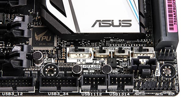 Есть и еще два переключателя: SLI/CFX switch и TPU switch. Переключатель SLI/CFX switch предназначен для конфигурации режимов SLI и CrossFire (запретить, установить режим для двух карт, установить режим для трех карт). Трехпозиционный переключатель TPU switch предназначен для автоматического разгона системы: можно запретить автоматический разгон, разрешить разгон только изменением коэффициента умножения или разрешить разгон за счет изменения коэффициента умножения и частоты BCLK.