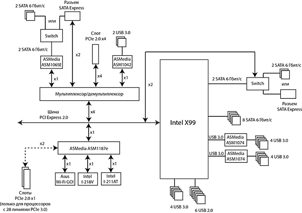 Еще раз подчеркнем, что все вышеизложенное — это лишь наше предположение. Но главное, что данный вариант демонстрирует, как все это может быть реализовано в соответствии со спецификацией чипсета Intel X99. Предполагаемая схема подключения контроллеров к чипсету показана на рисунке:
