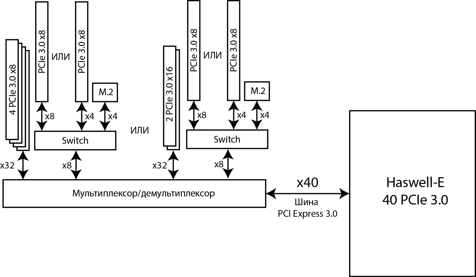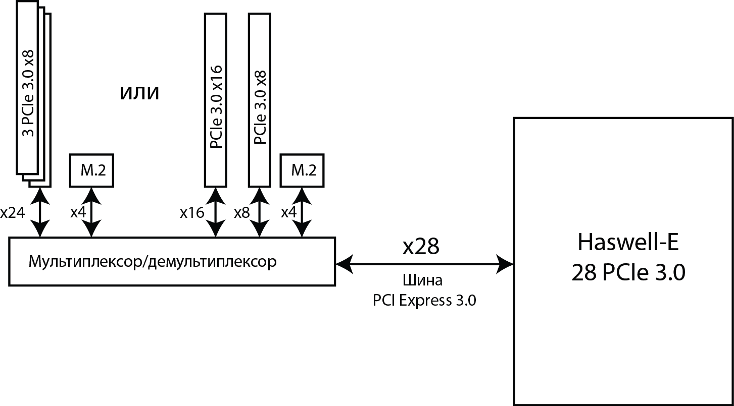 Когда на плату устанавливается процессор Haswell-E с 28 линиями PCI Express 3.0, ситуация кардинально меняется. В таком случае только три слота (первый, второй и четвертый, считая от процессорного разъема) будут реализованы на базе процессорных линий PCI Express 3.0. При этом они будут поддерживать следующие режимы работы: x16, x16/x8, x8/x8/x8.