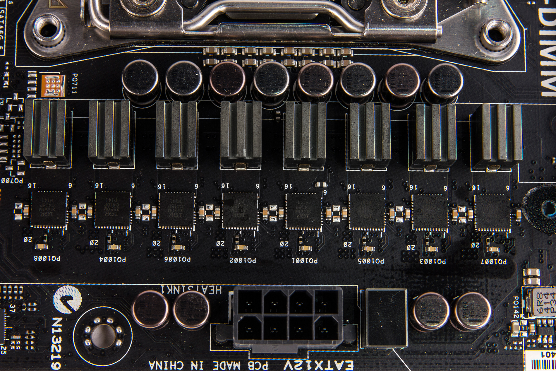 Регулятор напряжения питания процессора на плате является 8-канальным и основан на PWM-контроллере Digi+ VRM c маркировкой ASP1257. Сами каналы питания построены с использованием DrMOS-микросхем International Rectifier IR3550, которые объединяют в себе по два MOSFET-транзистора и управляющий MOSFET-драйвер.
