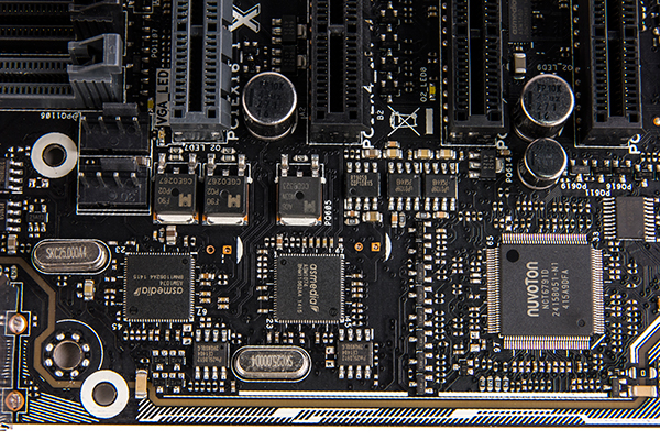 То есть для контроллера ASMedia ASM1042, SATA-контроллера ASMedia ASM106SE, одного разъема SATA Express и слота PCI Express 2.0 x4 в совокупности требуется только 4 порта PCI Express 2.0. Ну а если предположить, что три сетевых контроллера и разъем M.2 (PCIe x4) подключены через коммутатор ASMedia ASM1187e и все вместе задействуют только один чипсетный порт PCI Express 2.0, то для реализации все х контроллеров, разъемов и слотов потребуется только семь чипсетных портов PCI Express 2.0. также можно предположить, что в случае установки процессора Haswell-E c 28 линиями PCI Express 3.0, два дополнительных слота PCI Express 2.0 x1 будут скоммутированы на ASMedia ASM1187e и в этом случае количество задействованный чипсетных портов PCI Express 2.0 не меняется.