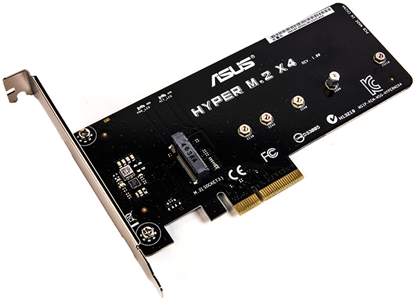 Ну и последняя особенность, которую стоит отметить, это наличие в комплекте опциональной платы Asus Hyper M.2 x4. Данная плата устанавливается в слот PCI Express x4 и представляет собой переходник с разъема PCI Express x4 на разъем M.2 (PCIe x4). Если установить эту плату в слот PCI Express 3.0 x16, то мы получим разъем M.2 на базе четырех линий PCI Express 3.0. Если же установить плату в слот PCI Express 2.0 x4, то мы получим разъем M.2 на базе четырех линий PCI Express 2.0. Одним словом, это универсальное решение. Причем разъем M.2 на плате Asus Hyper M.2 x4 поддерживает установку SSD-накопителей четырех типоразмеров: 2230, 2242, 2260 и 2280.