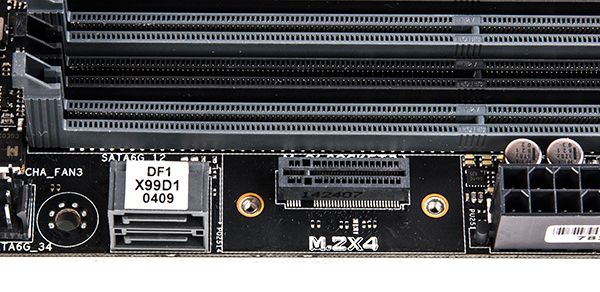 Также на плате Asus X99-Deluxe имеется и разъем нового поколения M.2, который реализован с использованием 4 портов PCI Express 3.0. Этот разъем имеет ключ типа M (Socket 3) и поддерживает установку только PCIe накопителей типоразмера 2242/2260/2280. Отметим, что на большинстве плат разъем M.2 реализован с использованием двух портов PCI Express 2.0. В сравнении с ним разъем M.2 нового поколения имеет в четыре раза большую пропускную способность (32 Гбит/с в каждую сторону вместо 8 Гбит/с). Ну и, как уже отмечалось, разъем M.2 на плате Asus X99-Deluxe реализован на базе процессорных портов PCI Express 3.0. Собственно, именно поэтому он и разделяем с одним из слотов с форм-фактором PCI Express x16.
