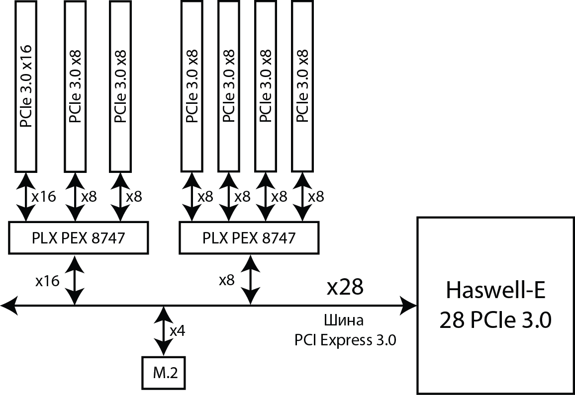 Теперь посмотрим, как реализованы слоты с форм-фактором PCI Express 3.0 х16 на плате Asus Х99-E WS с учетом наличия двух коммутаторов PLX PEX 8747. Тут возможны два варианта: когда устанавливается процессор с 40 линиями PCI Express 3.0, и когда устанавливается процессор с 28 линиями PCI Express 3.0.