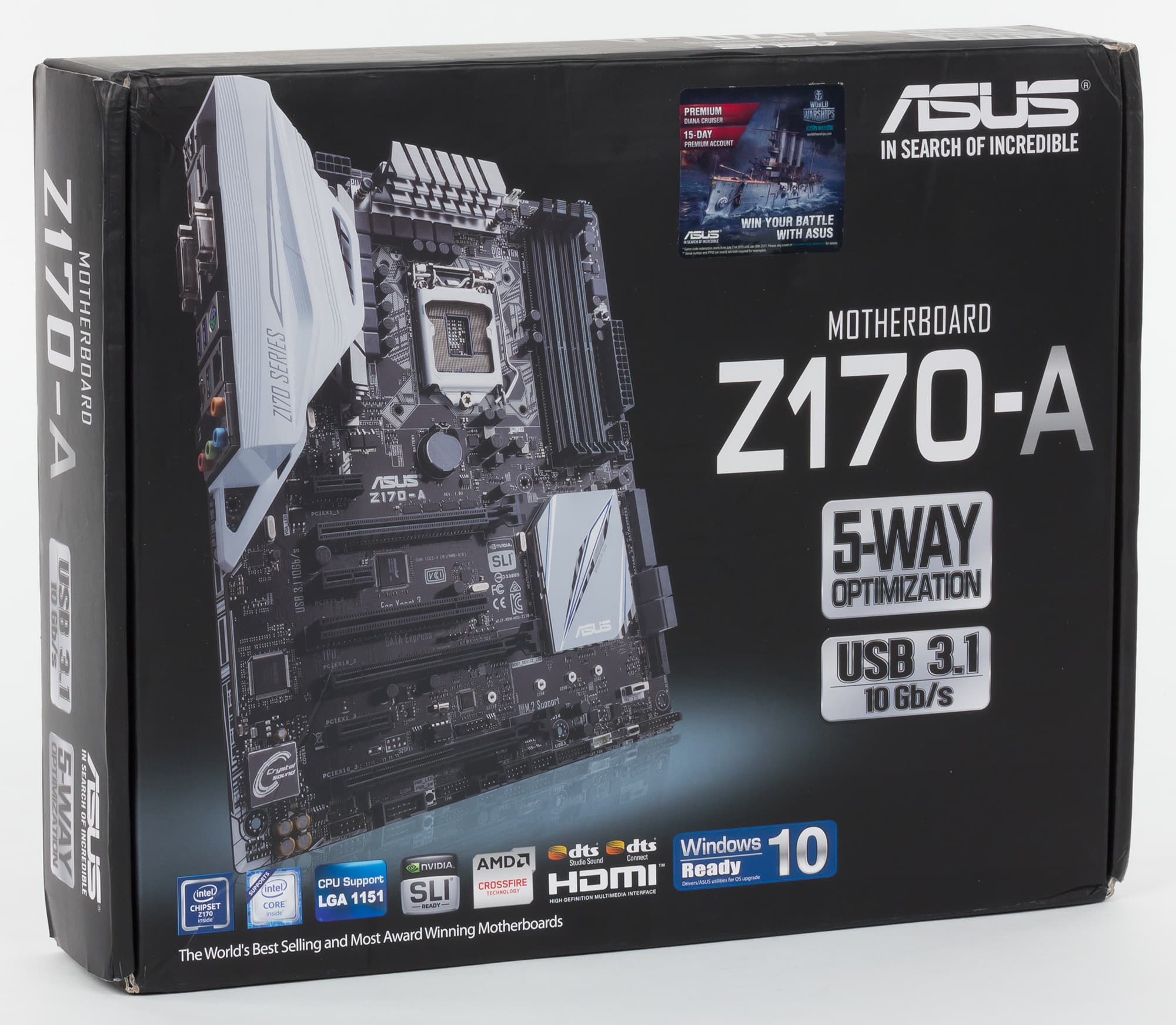 Плата Asus Z170-A поставляется в достаточно компактной коробке черного цвета, на которой описаны все ее основные преимущества.