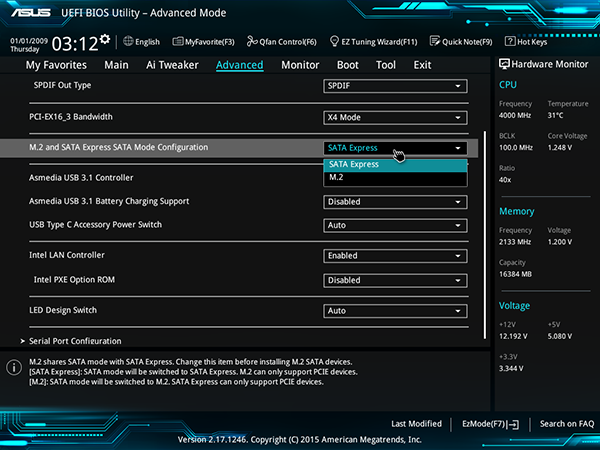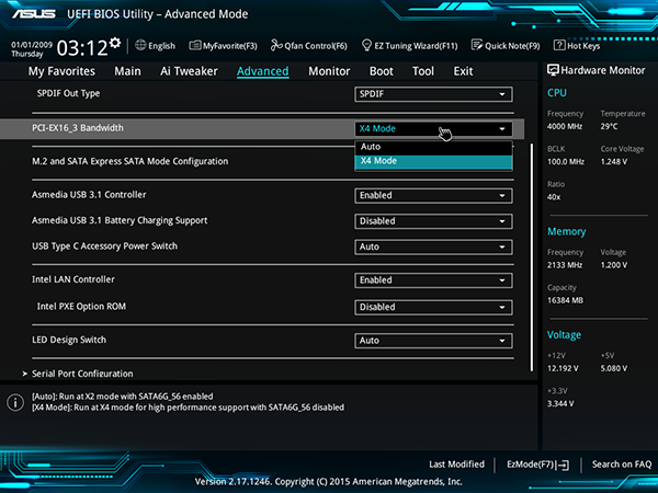 Если говорить об UEFI BIOS, то по интерфейсу и возможностям он не отличается от UEFI BIOS на плате Asus Z170-Deluxe. Отличия лишь в настройке работы слота PCI Express 3.0 x4 и разъемов M.2 и SATA Express, о чем мы уже писали. А потому мы не станем повторяться и еще раз описывать стандартные возможности UEFI BIOS на этой плате