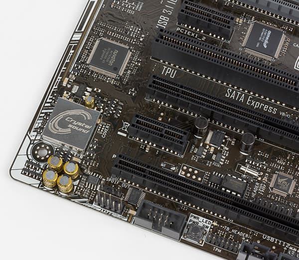 На плате есть два переключателя: TPU и EZ XMP. Переключатель TPU является трехпозиционным и предназначен для автоматического разгона системы. В одном положении автоматический разгон заблокирован, второе положение предназначено для умеренного разгона (при использовании воздушного охлаждения), а третье позволяет произвести разгон до более высокой тактовой частоты (при использовании водяного охлаждения). В качестве справки отметим, что в положении переключателя TPU I процессор Intel Core i7-6700K разгоняется до частоты 4,3 ГГц (разгон на 7%), а в положении переключателя TPU II производится разгон до частоты 4,6 ГГц (разгон на 15%). Переключатель EZ XMP предназначен для активации XMP-профиля памяти (если таковой предусмотрен). В принципе, то же самое можно сделать через UEFI BIOS, и данный переключатель просто дублирует одну из настроек UEFI BIOS.