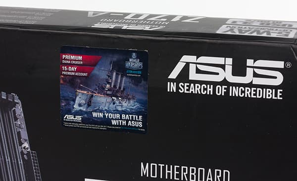 Здесь все довольно скромно. Нет ламинации, как на платах топового сегмента, нет ручки. Одним словом, бюджетный вариант упаковки. Правда, есть наклеенный стикер World of Warships (видимо, он присутствует на всех новых платах Asus, поставляемых в Россию). Этот стикер означает, что купив данную плату и зарегистрировав ее, пользователь получает премиум-аккаунт на 15 дней в игре World of Warships и уникальный корабль.