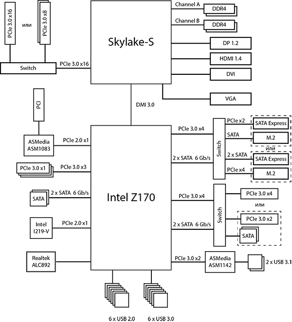 Блок-схема платы Asus Z170-A показана на рисунке.