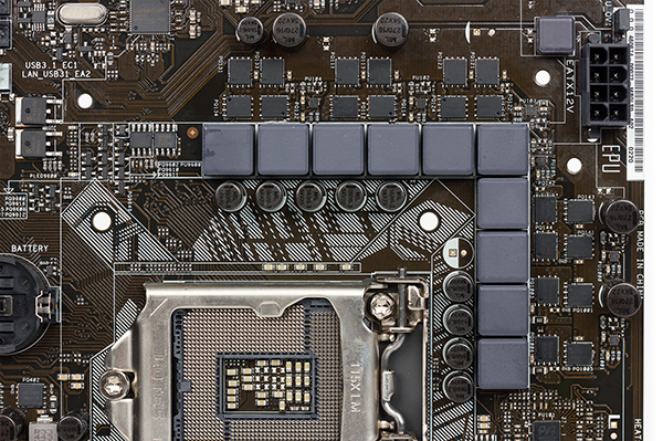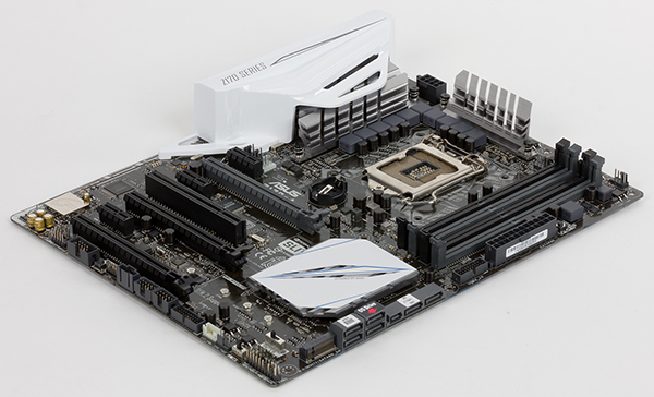 Для охлаждения различных тепловыделяющих компонентов на плате Asus Z170-A предусмотрено в совокупности три радиатора. Один радиатор установлен на чипсете, а два других расположены по бокам от процессорного разъема и закрывают MOSFET-транзисторы регулятора напряжения питания.