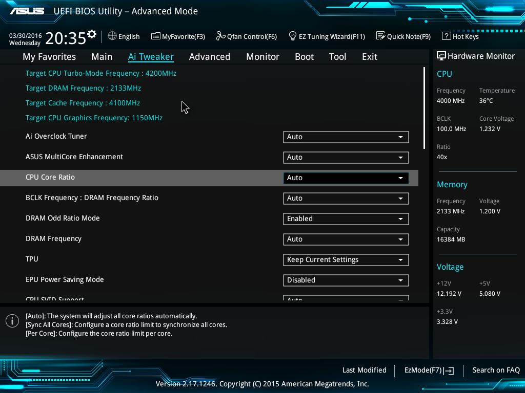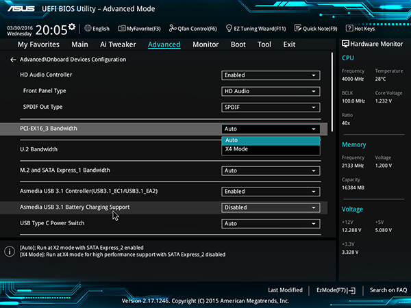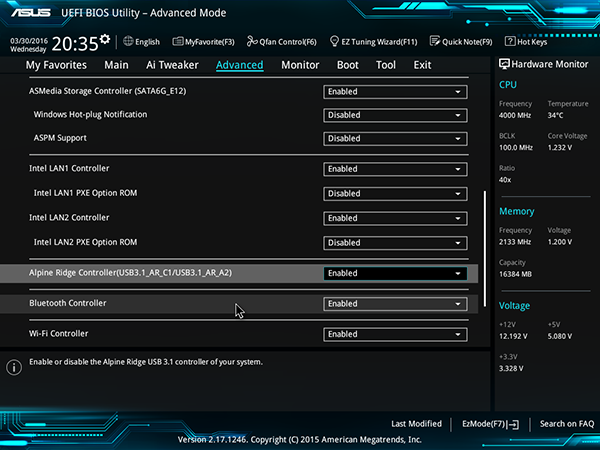 Рассказывать про UEFI BIOS платы Asus Z170-Premium просто нет смысла. Он практически ничем не отличается от UEFI BIOS на плате Asus Z170-Deluxe. Отличия есть лишь в нескольких пунктах, касающихся настройки разделяемых слотов и разъемов, а также настройки контролеров, которых нет на плате Asus Z170-Deluxe (например, Intel Alpine Ridge).