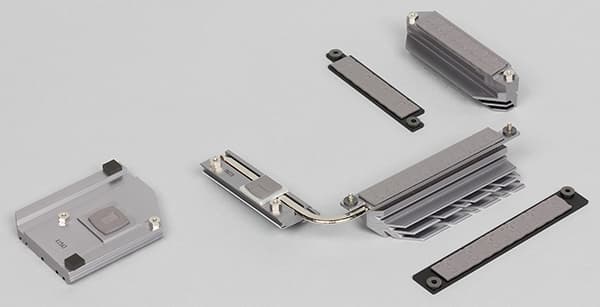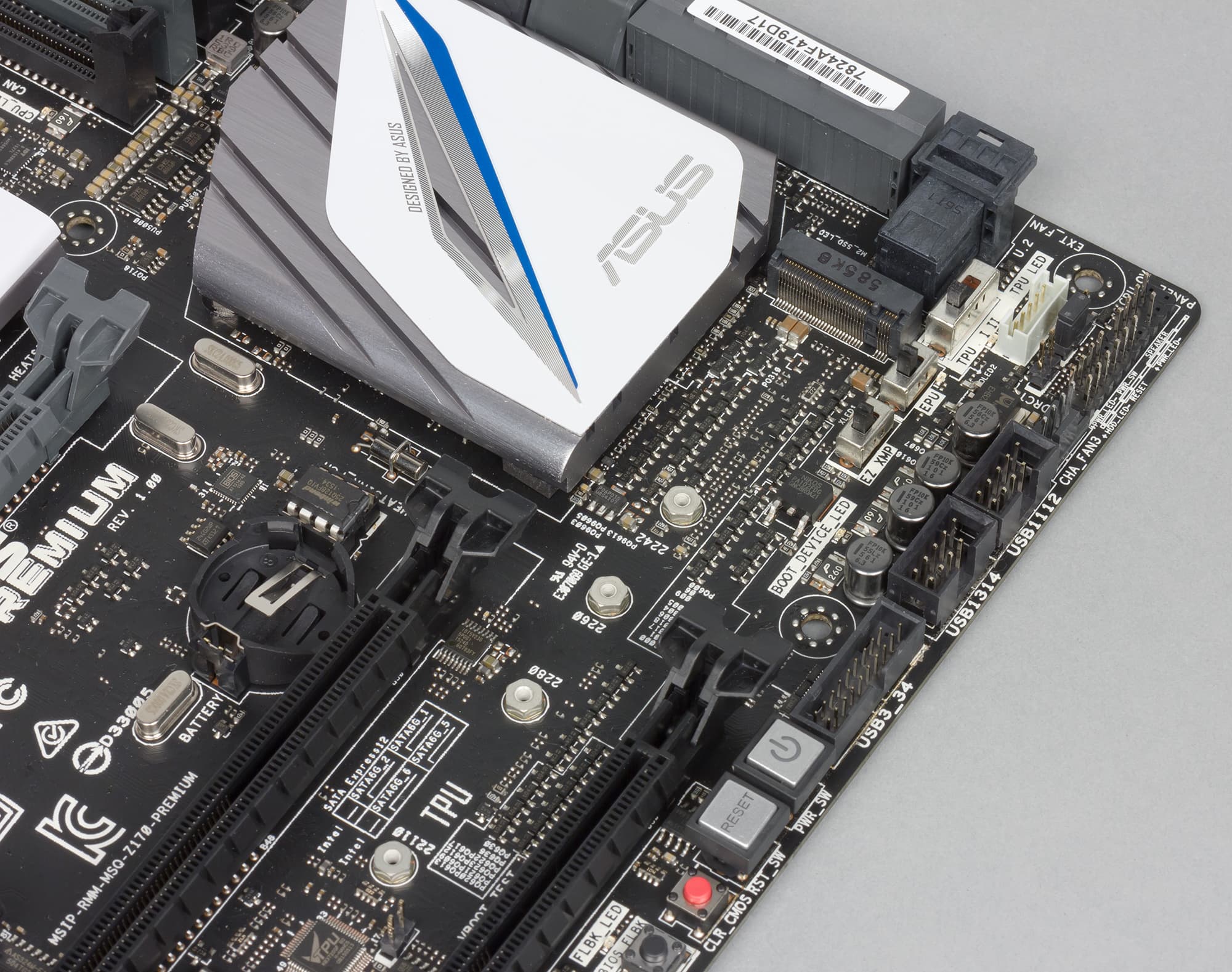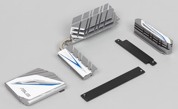 Для охлаждения различных тепловыделяющих компонентов на плате Asus Z170-Premium предусмотрено в совокупности четыре радиатора и две теплосъемные пластины. Один отдельный радиатор установлен на чипсете. Второй отдельный радиатор закрывает часть MOSFET-транзисторов регулятора напряжения питания процессора. А еще один радиатор состоит из двух частей, связанных тепловой трубкой и соединенных в форме буквы «Г». Одна часть этого радиатора закрывает оставшуюся часть MOSFET-транзисторов регулятора напряжения питания процессора, а другая — коммутатор линий PCIe ASMedia ASM1187e.