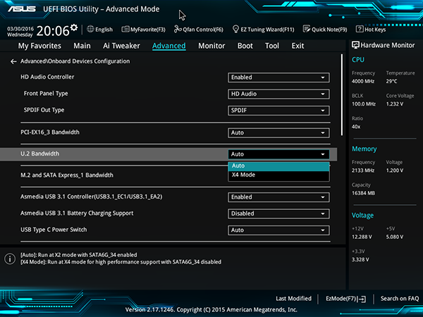 Кроме того, разъем U.2 выполнен разделяемым с двумя чипсетными портами SATA 6 Гбит/с (два отдельных порта). Если разъем U.2 работает в режиме x4, то два порта SATA 6 Гбит/с будут недоступны. Если же разъем U.2 работает в режиме x2, то порты SATA 6 Гбит/с будут доступны. Отметим, что по умолчанию разъем U.2 работает в режиме x2, а настройка режима его работы реализуется в UEFI BIOS.