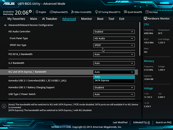 Далее, слот PCI Express 3.0 x4 (слот с форм-фактором PCI Express x16) выполнен разделяемым со вторым разъемом SATA Express_2. То есть либо слот PCI Express 3.0 x4 работает в режиме x4, и тогда разъем SATA Express_2 будет недоступен, либо PCI Express 3.0 x4 работает в режиме x2 и в этом случае разъем SATA Express_2 будет доступен. Отметим, что по умолчанию слот PCI Express 3.0 x4 работает в режиме x2, а настройка режима его работы реализуется в UEFI BIOS.
