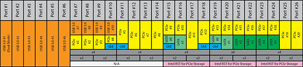 Как видим, при такой схеме подключения задействуется ровно 26 высокоскоростных портов и не превышено ограничение по количеству портов USB 3.0 (6 портов), SATA 6 Гбит/с (6 портов) и портов PCIe 3.0 (18 портов).