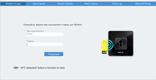 Кроме того, удалось настроить возможность входа в систему с использованием Android-смартфона. Для этого на смартфон с NFC-модулем устанавливается специальное приложение Asus (NFC Express). Далее в этом приложении на смартфоне создается учетная запись (имя и пароль), которые используются для входа в систему. Приложив смартфон к NFC-модулю на этапе загрузки системы, можно войти в систему.