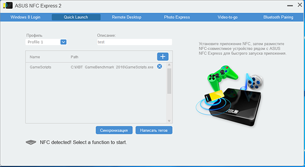 Есть и другие функциональные возможности, которые можно реализовать с помощью модуля Asus NFC Express 2 и NFC-смартфона. Это функции Remote Desktop, Photo Express, Video-to-go и Bluetooth Painting. И если вы знаете английский, то, возможно, что-нибудь из данных функций даже получится настроить. Но это если хватит терпения, поскольку работает все «через пень-колоду». При загрузке системы вход с использованием NFC-смартфона (кстати, в нашем случае это был Asus Zenfone 2) срабатывает далеко не всегда с первого раза. NFC-метка также не всегда распознается сразу. В общем, как показала практика, вводить пароль вручную проще и быстрее. Действительно, NFC-метку еще нужно найти и достать (например, из кармана). На это уходит время, и хорошо еще, если она сработает с первого раза, что бывает далеко не всегда. Со смартфоном ситуация еще хуже. Мало того, что его нужно достать, так еще нужно на нем запустить соответствующее приложение, пару раз ткнуть в экран и только после этого прикладывать к NFC-модулю. И опять же, хорошо, если повезет с первого раза.