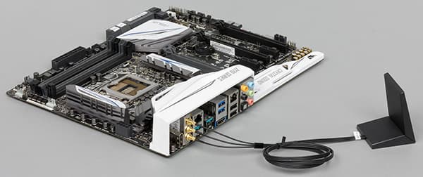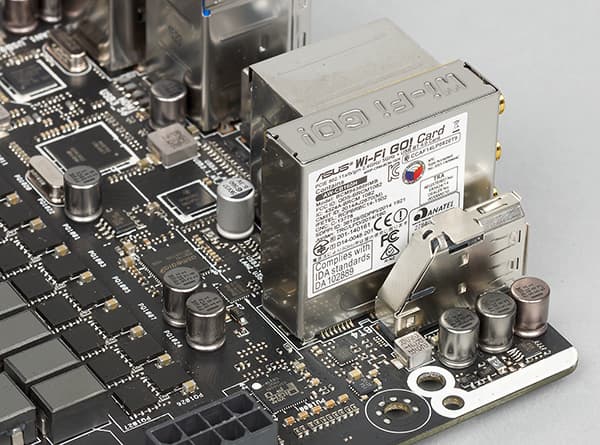 Также плата снабжена интегрированным двухдиапазонным (2,4 и 5 ГГц) модулем Asus WiFi Go! (Wi-Fi + Bluetooth 4.0). Модуль является трехантенным и поддерживает стандарты 802.11a/b/g/n/ac, а максимальная скорость передачи составляет 1300 Мбит/с (для стандарта 802.11ac). Судя по маркировке, этот модуль сделан на базе контроллера Broadcom BCM94360.