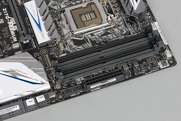 Для установки модулей памяти на плате Asus Z170-Premium предусмотрено четыре DIMM-слота. В руководстве пользователя отмечается, что плата поддерживает небуферизованную память DDR4 (non-EСС), а максимальный объем памяти составляет 64 ГБ (при использовании модулей емкостью по 16 ГБ).