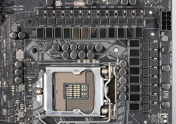 Регулятор напряжения питания процессора на плате является 20-канальным и основан на PWM-контроллере с маркировкой Digi+ VRM ASP14051. 16 каналов питания предназначены для вычислительных ядер процессора, а еще 4 — для графического ядра и системного агента. Сами каналы питания построены с использованием дискретных MOSFET-транзисторов NTMFS4C09N (максимальный ток 52 А) компании On Semiconductor и драйверов International Rectifier IR3598, которые расположены с обратной стороны платы. Всего таких драйверов 10 (каждый драйвер управляет двумя каналами питания).