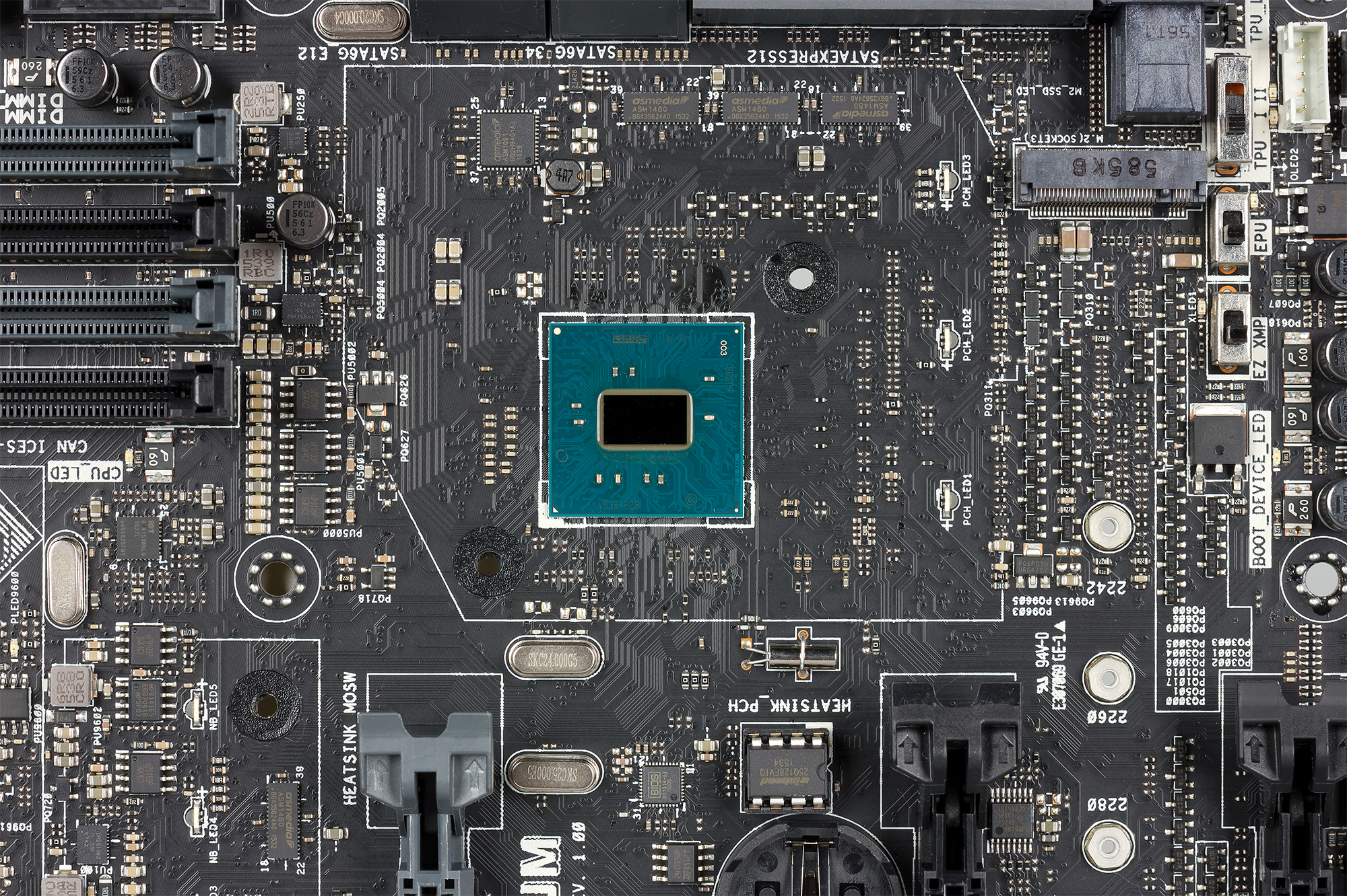 Также имеется два контроллера ASMedia ASM1142, под которые требуется четыре порта PCIe 3.0, разъем M.2, под который требуется еще четыре порта PCIe 3.0, разъем U.2 — это еще четыре порта PCIe 3.0 и два разъема SATA Express (еще четыре порта PCIe 3.0). Добавим к этому два сетевых контроллера, под которые требуется еще два порта PCIe, SATA-контроллер ASMedia ASM1061, под который задействуется еще один порт PCIe. Кроме того, учтем наличие слота PCI Express 3.0 x4 и четырех слотов PCI Express 2.0 x1. Понятно, что при таком количестве разъемов, слотов и контроллеров что-то с чем-то должно разделяться.