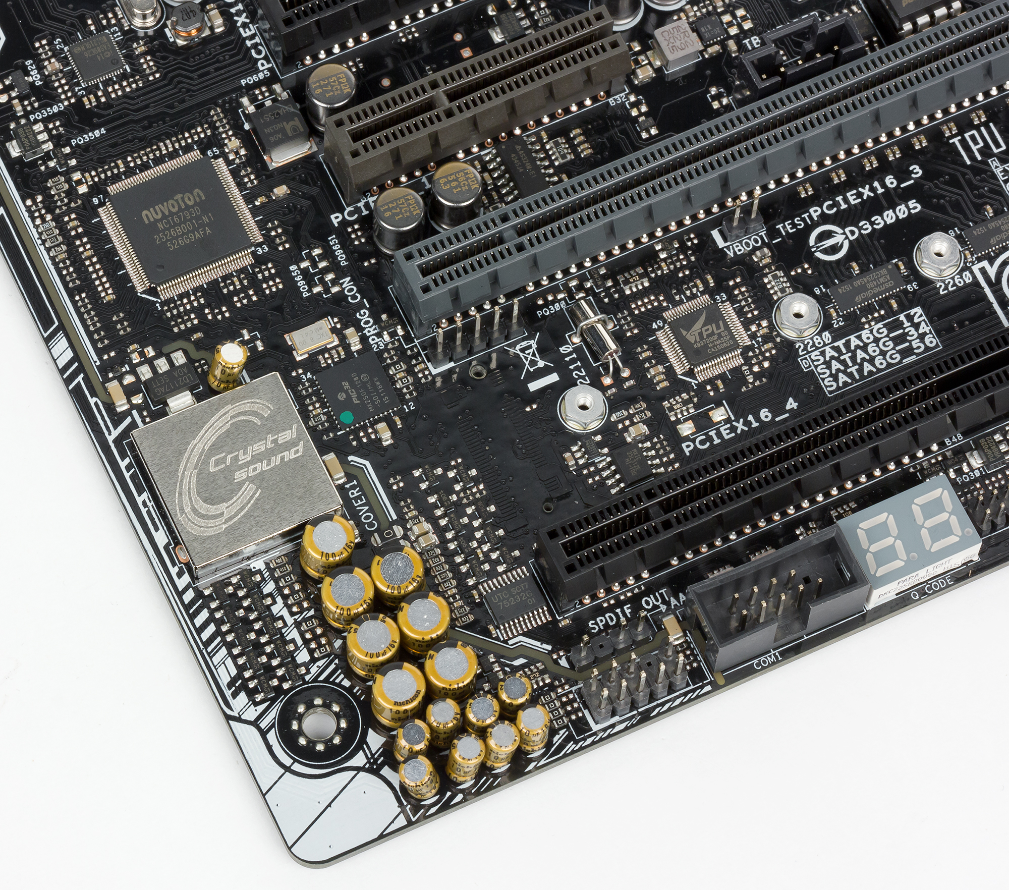 Итак, на плате имеется слот PCI Express 3.0 x4 (слоты PCI Express 3.0 x16 мы не считаем, поскольку они реализованы на базе процессорных линий PCIe 3.0), два разъема M.2 (PCIe 3.0 x4 и SATA), разъем U.2 (PCIe 3.0 x4), два гигабитных сетевых контроллера и контроллер USB 3.1. Кроме того, задействовано шесть портов USB 3.0 (пять отдельных портов и один порт для подключения USB 3.0 хаба) и реализовано шесть портов SATA 6 Гбит/с. При этим, нужно учесть, что часть разъемов могут работать либо в режиме PCIe, либо в режиме SATA. Так, для разъемов M.2 будет реализован или режим PCIe, или режим SATA и каждый разъем M.2 задействует только четыре высокоскоростных порта чипсета (или четыре порта PCIe 3.0, или один порт SATA 6 Гбит/с).