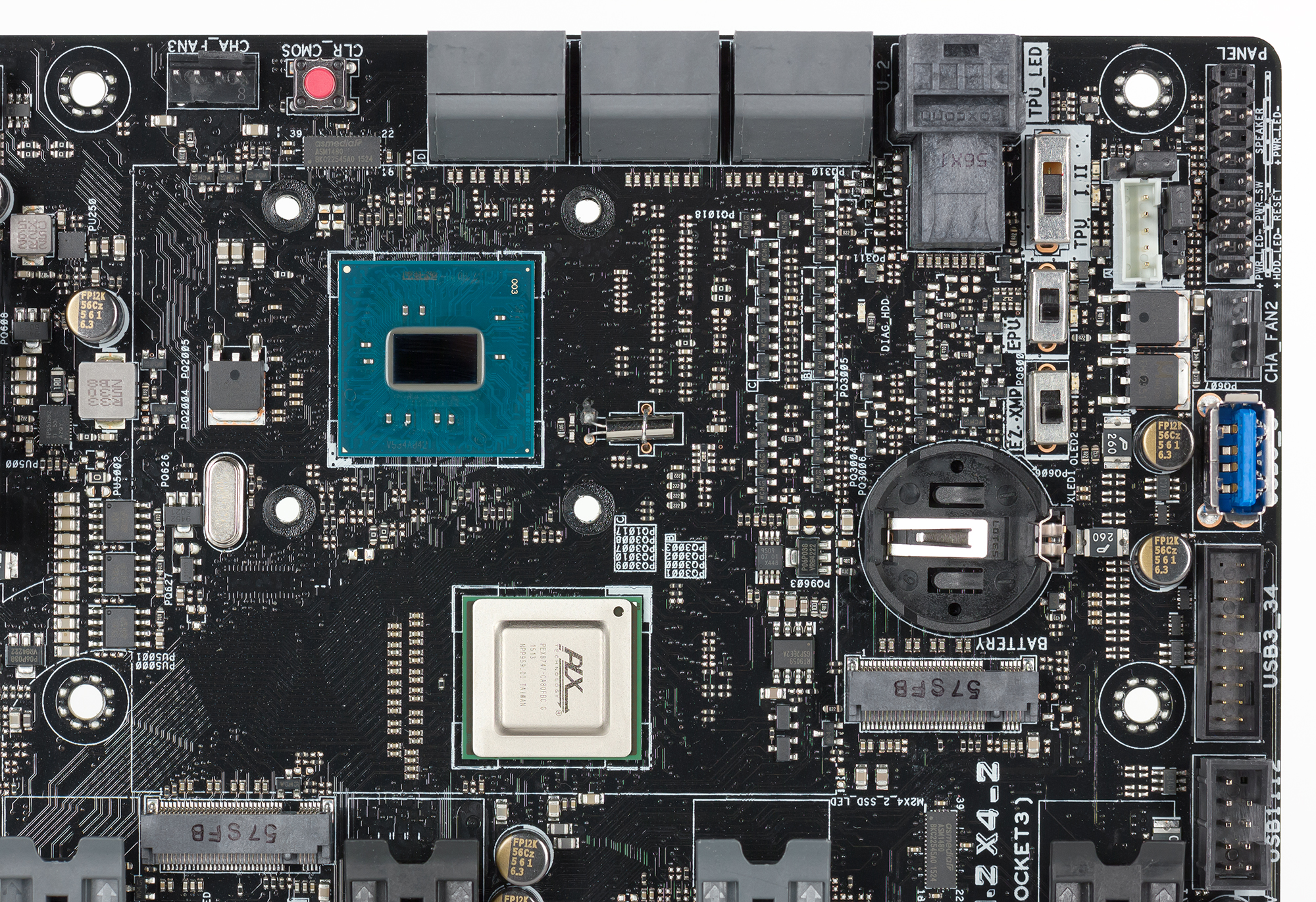 Логично предположить, что этот коммутатор подключен к 16 линиям PCI Express 3.0 процессора Skylake, которые он преобразует в 32 линии PCI Express 3.0.