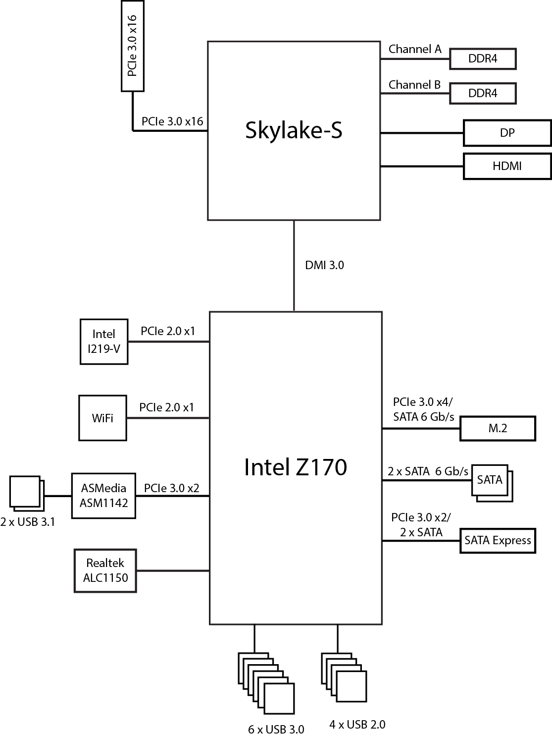 Напомним, что чипсет Intel Z170 имеет до 20 портов (линий) PCI Express 3.0, до 10 портов USB 3.0 и до 6 портов SATA 6 Гбит/с. При этом всего может быть не более 26 высокоскоростных портов (PCIe, USB 3.0 и SATA 6 Гбит/с), причем к 20 портам PCIe 3.0 одновременно можно подключить не более 16 PCIe устройств (контроллеров, разъемов и слотов) с учетом того, что одно устройство может задействовать один, два или четыре порта PCIe.