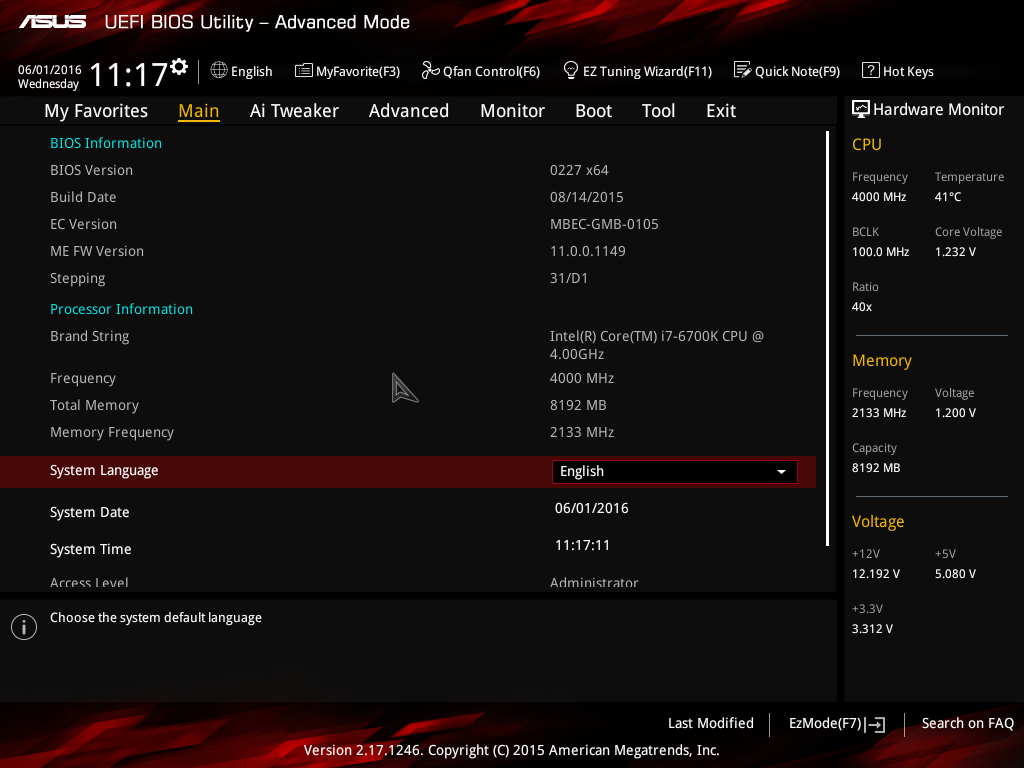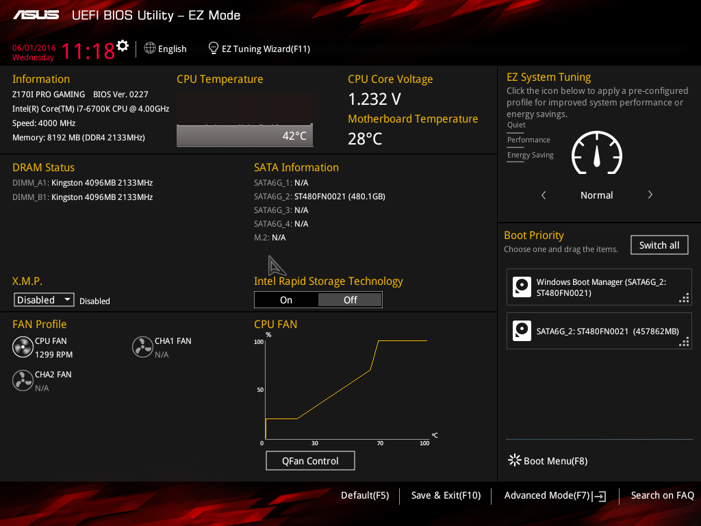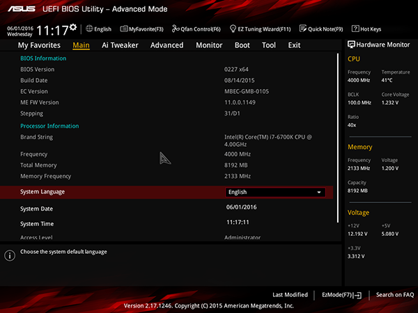 В заключение рассмотрим особенности настройки платы Asus Z170I Pro Gaming через UEFI BIOS.