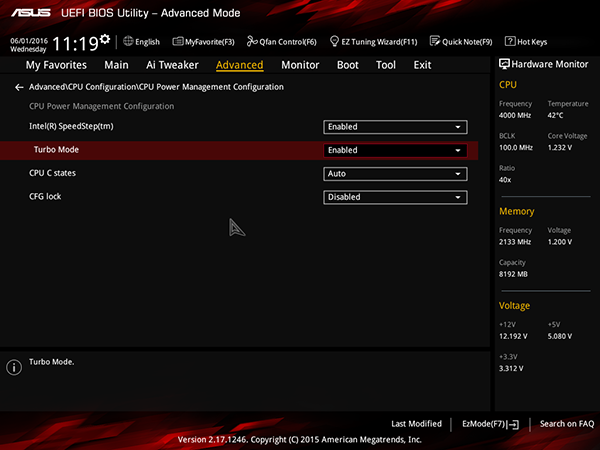 И точно также, как и на всех платах Asus, разгон разблокированного процессора (K-серии) возможен только в случае, когда активирован режим Turbo Mode (он активирован по умолчанию). Активирование данного режима производится на вкладке Advanced в меню CPU ConfigurationCPU Power Management Configuration.