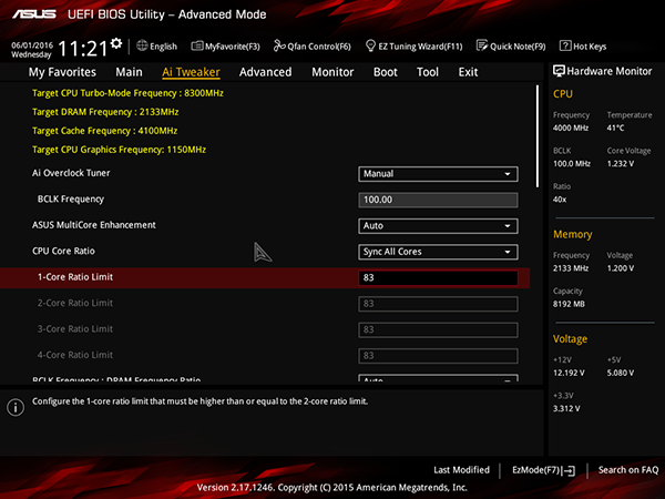 В этом случае имеется возможность менять частоту тактового генератора BCLK (BCLK Frequency) и коэффициент умножения ядер процессора (CPU Core Ratio). Частота BCLK меняется вплоть до значение 500 МГц, а максимальный коэффициент умножения можно установить равным 83.