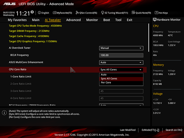 Можно задавать коэффициент умножения для каждого случая числа загруженных ядер процессора, а можно задавать коэффициент умножения одновременно для всех загруженных ядер процессора.