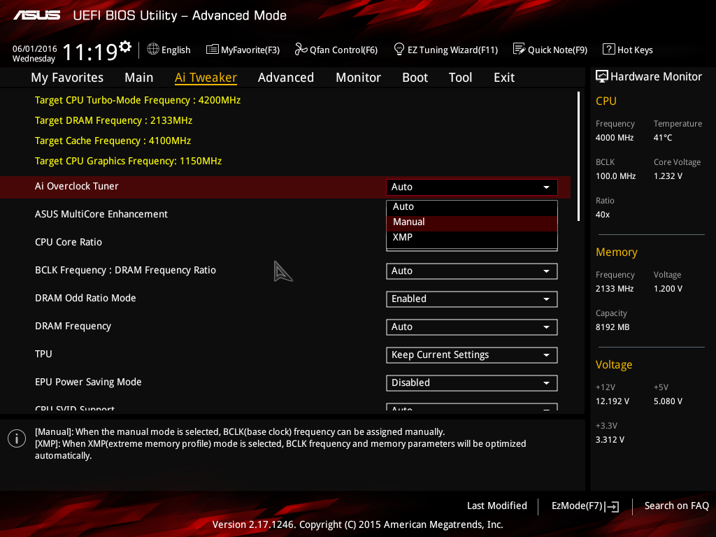 Кроме того, для разгона процессора на плате Asus Z170I Pro Gaming (как, кстати, и на других платах Asus) на вкладке Extreme Tweaker для параметра Ai Overclock Tuner нужно установить значение Manual или XMP.