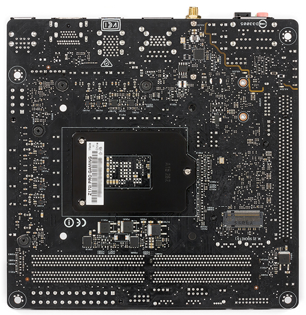 Для установки видеокарты, плат расширения и SSD-накопителей на материнской плате Asus Z170I Pro Gaming имеется один слот PCI Express 3.0 x16 и разъем M.2, который позволяет устанавливать накопители типоразмера 2242/2260/2280. Сам разъем M.2 расположен с обратной стороны платы, что, кстати, вполне типично для плат с таким форм-фактором. Отметим, что всего на плате только два отверстия под крепежные винты, а накопитель в типоразмером 2242 можно установить только с использованием специального монтажного удлинителя, входящего в комплект, используя при этом отверстие под накопитель с типоразмером 2260.
