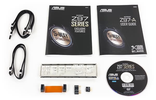 Комплектация платы Asus Z97-A довольно скромная. Кроме самой платы в коробке поставляется инструкция пользователя (только на английском языке), DVD-диск с программным обеспечением и драйверами, три SATA-кабеля (все разъемы с защелками, один кабель имеет угловой разъем с одной стороны), мостик SLI, заглушка для задней панели платы и традиционный Asus Q-коннектор для облегчения подключения проводов от кнопки питания, перезагрузки и пр. к плате. Как видим, ничего лишнего в комплектацию не входит — только самое необходимое.